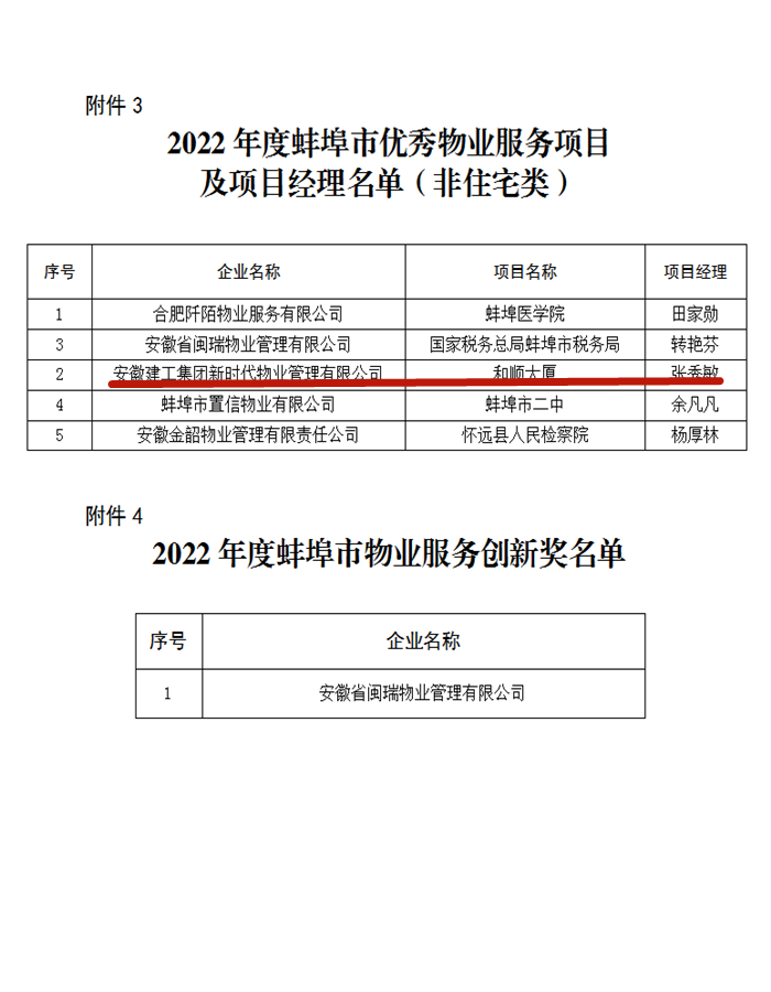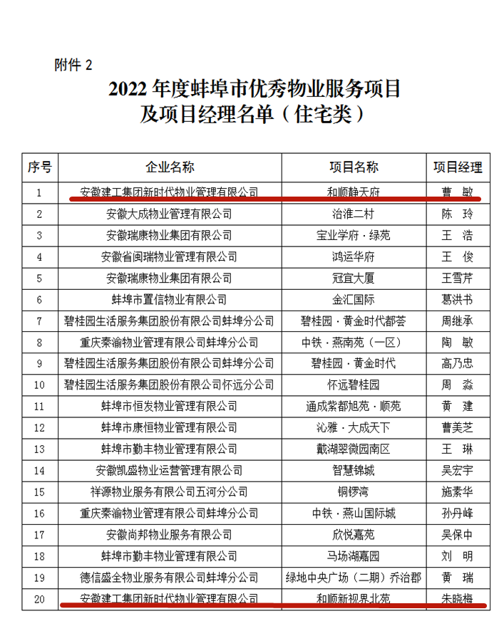 近日,从蚌埠市物业管理协会传来喜讯,安徽建工集团新时代物业管理有限公司(以下简称物业公司)荣获2022年市级多个荣誉称号!这是首次物业公司多个项目同时获评蚌埠市“市级”荣誉称号。