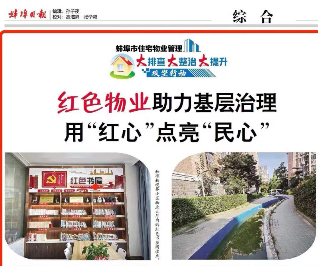 2023年10月25日<蚌埠日报>报道了安徽建工集团新时代物业管理有限公司蚌埠和顺新视界项目坚持党建引领,着力打造“红色社区”“幸福社区”,获评安徽省“皖美红色物业”示范小区的先进事迹。下一步,新时代物业公司将以此为契机,继续推进党建与物业服务深度融合,持续提升服务质量,当好群众的贴心管家。