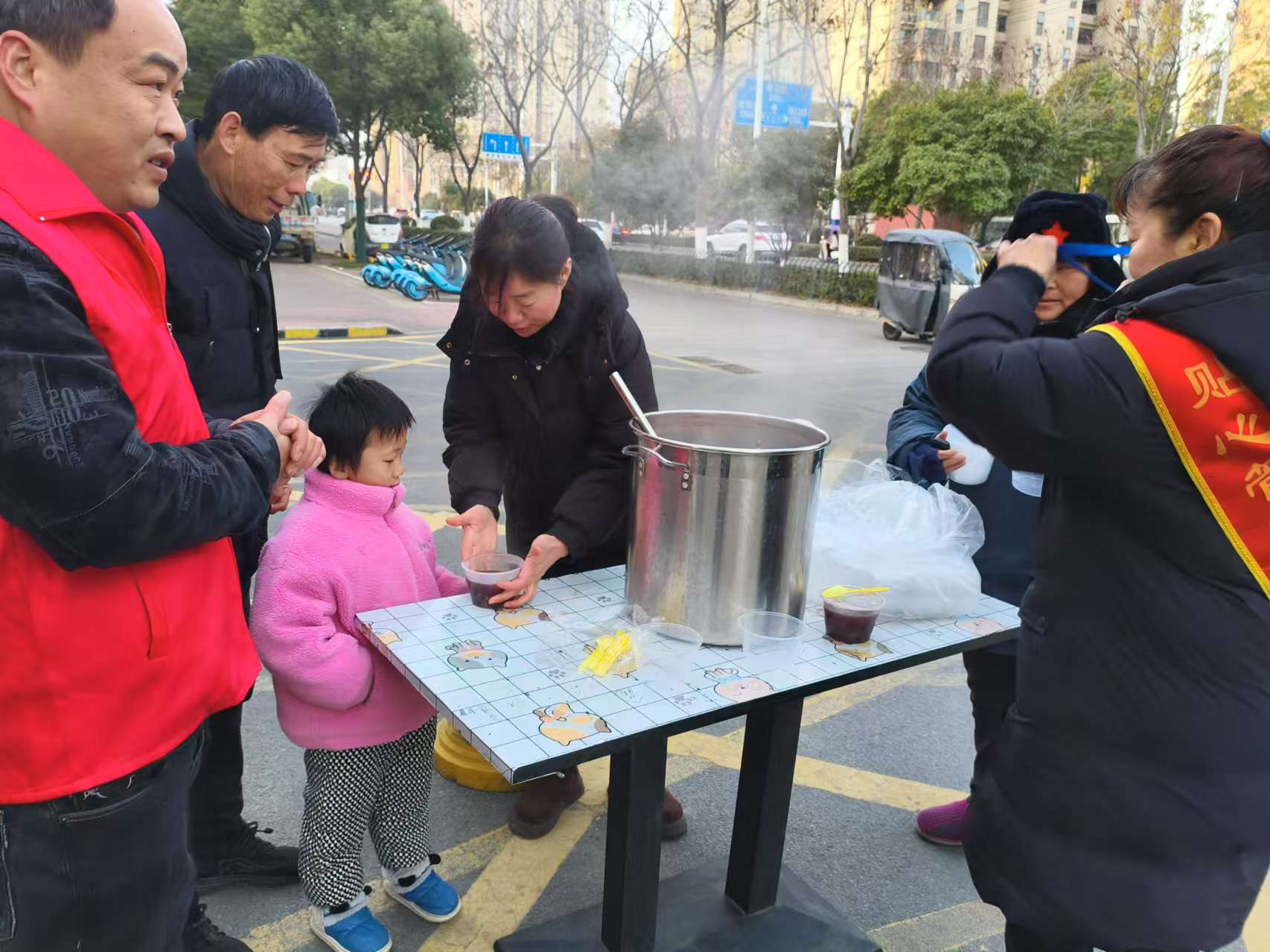 居民们纷纷闻讯赶来,老人们带着孩子,年轻人陪着长辈,大家欢声笑语,汇聚成一片欢乐的海洋。物业工作人员热情地为居民们盛上一碗碗热气腾腾的腊八粥,还细心地准备了一次性餐具,方便大家食用。现场暖意融融,邻里间的问候交谈声此起彼伏,情谊在这一碗粥中升温。