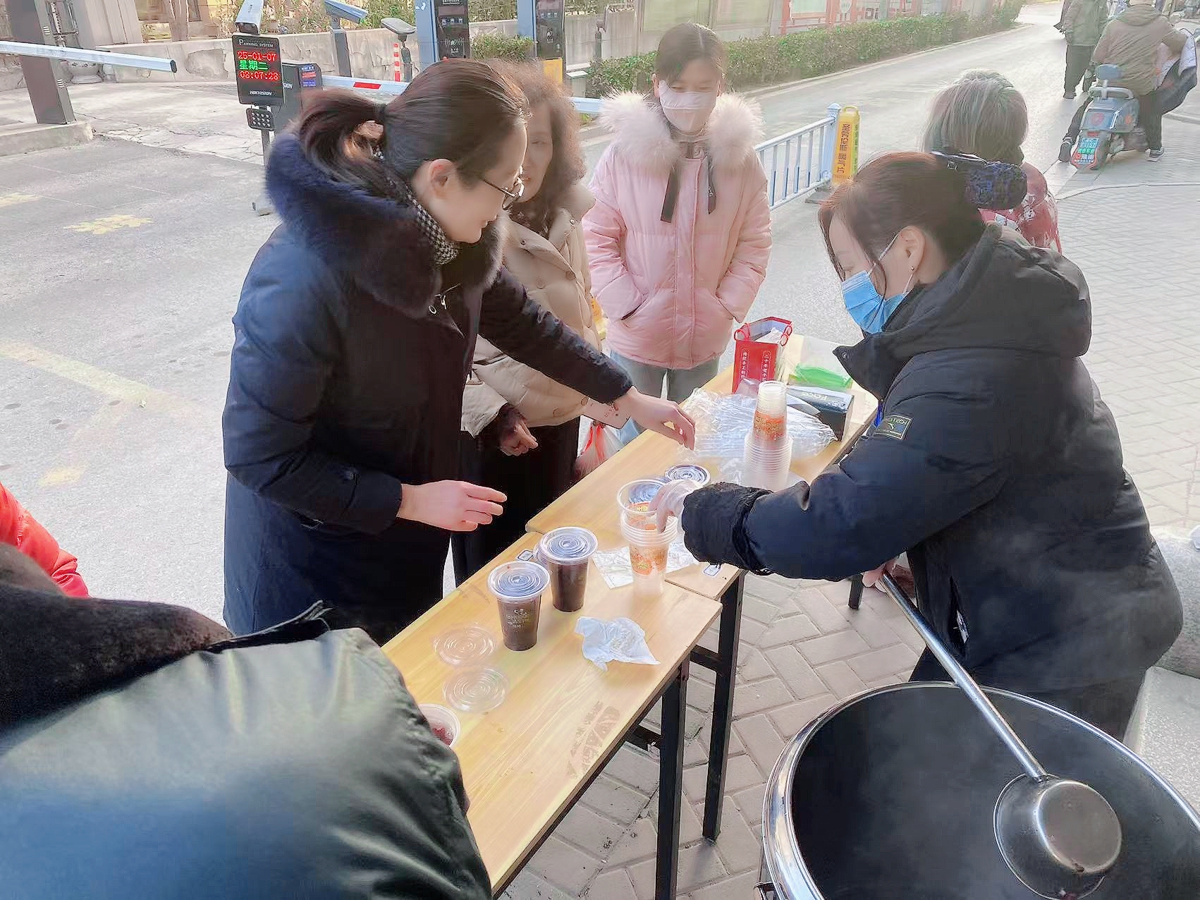 晨光熹微,在不同地方,相同的时间里上演着同样的剧情,各个项目的物业工作人员化身“节日使者”,早早忙碌开来,为腊八节活动准备着。园区广场上、小区大门旁,煮好的腊八粥搭配着茶叶蛋已经端上桌来,锅中热气腾腾,散发着腊八粥诱人的香气。精心熬制的腊八粥,选用了上等的糯米、红豆、红枣、桂圆等食材,寓意着吉祥、团圆、幸福与安康,每一口都是满满的心意。